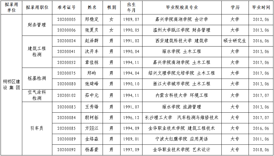 紹興市柯橋區(qū)建設(shè)集團有限公司擬錄用人員公示